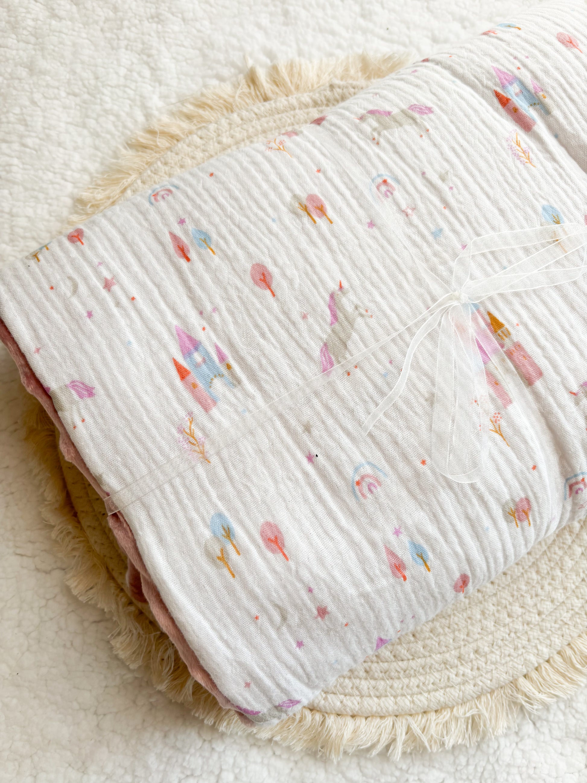 La couverture d'hiver feerique en gaze de coton et minky est parfaite pour garder bébé douillet et au chaud pendant les mois froids. Son tissu doux et moelleux les enveloppera dans un cocon de confort. Adorablement décorée avec une licorne, elle éveillera l'imagination de votre enfant et ajoutera une touche de magie à ses nuits.